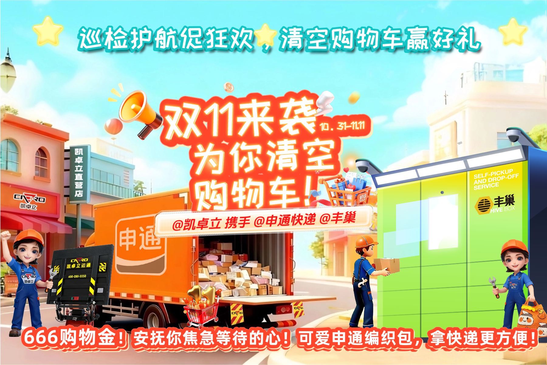 清空購(gòu)物車(chē)迎好禮!凱卓立 × 申通 × 豐巢雙十一巡檢護(hù)航,促狂歡。 親愛(ài)的 “剁手黨” 們,雙十一的快遞是不是已經(jīng)讓你忍不住刷了八百遍物流信息?別慌!為了讓你順順利利拿到每一個(gè)包裹,凱卓立攜手申通快遞、豐巢,開(kāi)啟雙十一巡檢護(hù)航促狂歡活動(dòng),從物流運(yùn)輸?shù)侥┒私桓叮虨槟愕陌?“保駕護(hù)航”!